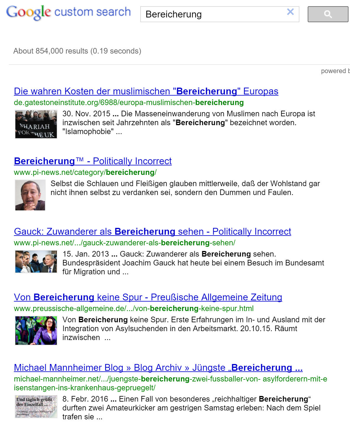 Machen Sie eine Testsuche, und dann vergleichen Sie die Resultate mit der normalen politisch korrekten Google Suche. Wir benutzen nur noch diese Suche, wir sind wirklich begeistert von den Ergebnissen. Suchen Sie nach Ihrer Heimatstadt, oder über Rassenunterschiede, schwarze Kriminalität, Lügenpresse,