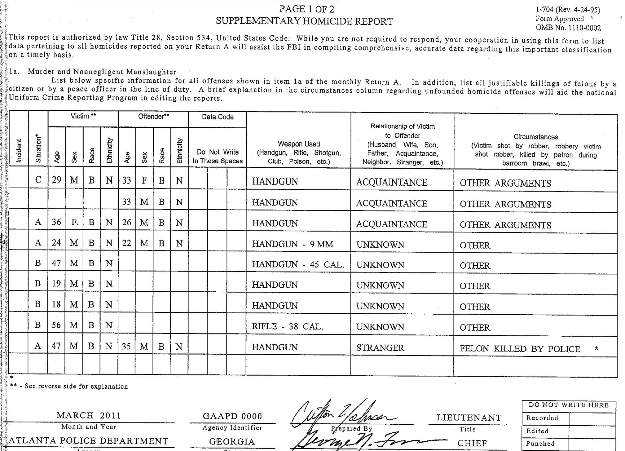 Von Januar 2011 bis März 2011 gab es 12 Morde in Atlanta. Dieser Tötungsdelikte, 12 wurden von Afro-Amerikaner, oder 100 Prozent der Tötungsdelikte begangen.