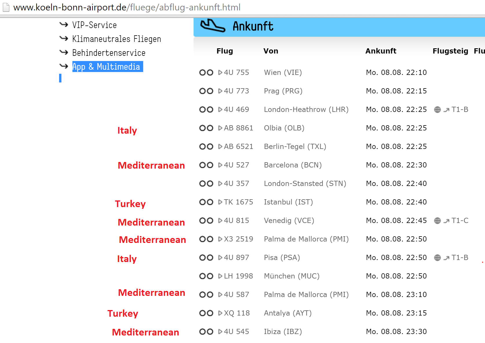 Das große Landen geht die ganze Nacht über weiter und endet erst gegen sechs Uhr morgens. Im Link ist das beispielhaft für den Flughafen Köln-Bonn zu sehen: Am Tag wird bloß eine Maschine aus dem östlichen Mittelmeer gemeldet. Der Tourismus ist schließlich durch die vielen Terroranschläge regelrecht eingebrochen. Nachts sind es aber gleich elf Maschinen: