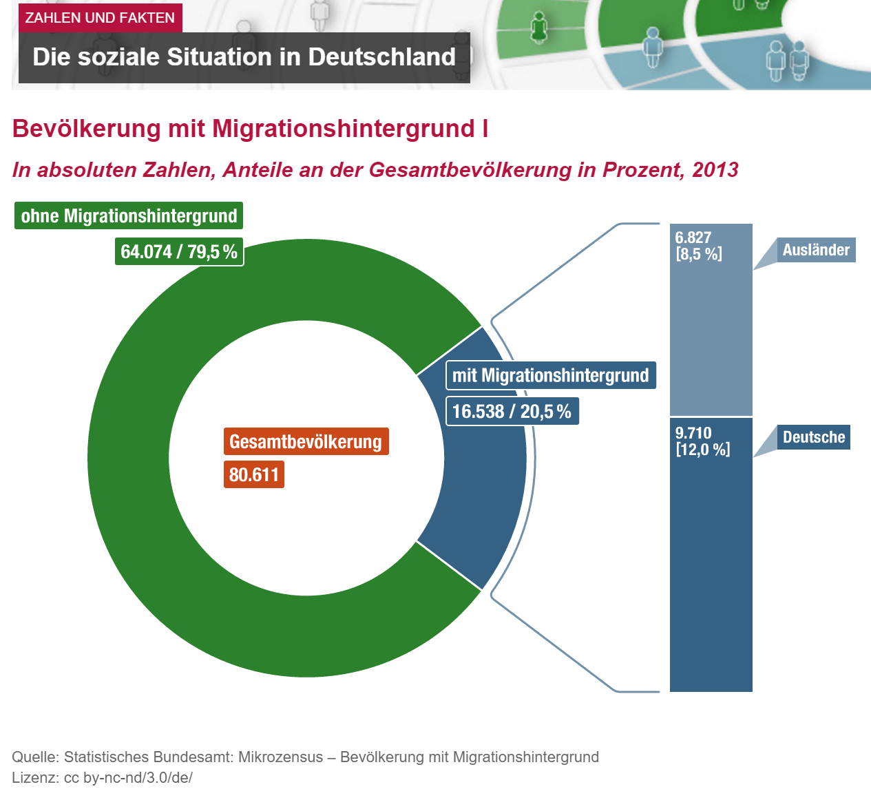 2013 gab es 79.5% (64,074 Mio.) Deutsche ohne Migrationshintergrund, 20.5% (16,538 Mio.) mit Migrationshintergrund. Davon 8.5% (6.827 Mio.) Ausländer ohne deutschen Pass. 91.5% (73784)also sind Deutsche